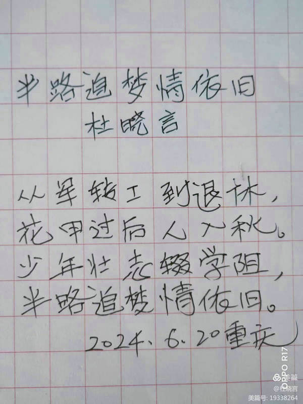 仿宋半路追夢情依舊杜曉言從軍轉工到退休,花甲過后人入秋。少年壯志輟學阻,半路追夢情依舊。重慶...