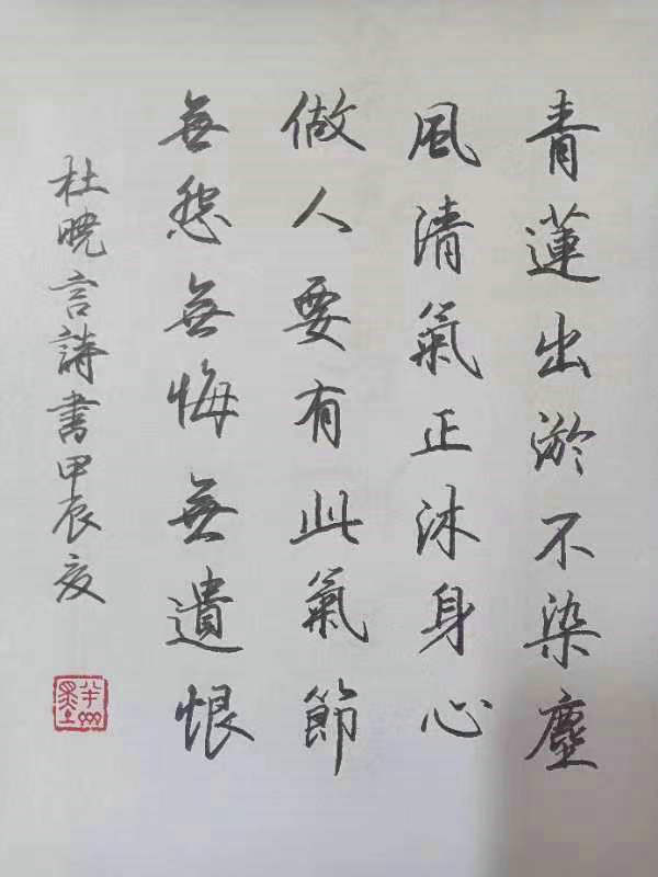 青蓮出淤不染塵2024-06-27仿宋青蓮出淤不染塵杜曉言詩(shī)孫生(全國(guó)硬筆書法大賽一等獎(jiǎng)獲得者)青蓮出淤不染塵,風(fēng)清氣正沐身心。做人若有此氣節(jié),無怨無悔無遺恨。重慶...