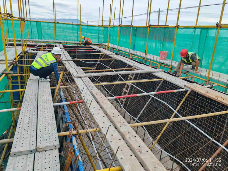 臺(tái)身前墻及側(cè)墻第一層模板報(bào)驗(yàn)2024-07-09圖為新疆兵團(tuán)建工水電集團(tuán)市政路橋公司第五師雙河市沙山子線公路互通立交工程大橋左幅號(hào)橋臺(tái)臺(tái)身前墻及側(cè)墻第一層模板報(bào)驗(yàn)。王小丫攝...