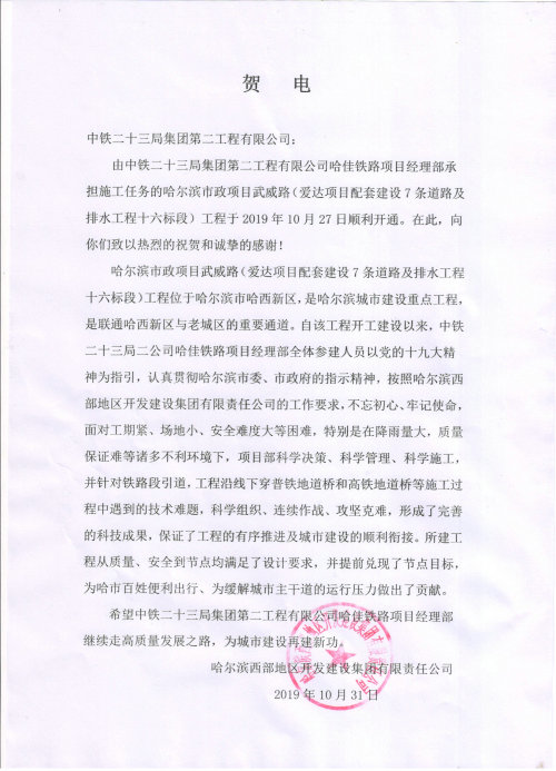 11月9日,中鐵二十三局二公司哈佳鐵路項(xiàng)目部收獲了哈爾濱西部地區(qū)開發(fā)建設(shè)集團(tuán)有限責(zé)任公司發(fā)來(lái)的賀電,祝賀承建的哈爾濱市政武威路工程的正式開通。