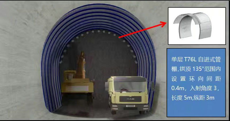 再次在下穿鐵路兩側(cè)各50米范圍內(nèi),初期支護(hù)采用厚度為230毫米的Ф8@200X200毫米掛網(wǎng)噴射鋼纖維混凝土,同時(shí)配合使用間距為0.5米的工16型鋼拱架。初期支護(hù)完成后,及時(shí)進(jìn)行初支背后充填注漿,以確保支護(hù)結(jié)構(gòu)的穩(wěn)定。在超前支護(hù)方面,采用拱部135度范圍內(nèi)的單層T76L自進(jìn)式管棚,管棚長(zhǎng)度為5米,環(huán)距400毫米,縱距3米,外插角為3度,有助于增強(qiáng)隧道結(jié)構(gòu)的穩(wěn)定性和安全性。