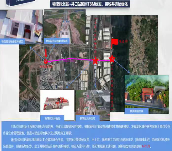 通過(guò)對(duì)區(qū)間地面環(huán)境和前后工點(diǎn)情況綜合考慮,決定優(yōu)化新增始發(fā)井、出土井,盾構(gòu)施工完成后由臨標(biāo)車站(物流園北站)完成盾構(gòu)機(jī)接收吊裝出井,創(chuàng)建新增始發(fā)井、出土井模型結(jié)合BIM盾構(gòu)模型,經(jīng)驗(yàn)證方案可行性,新方案規(guī)避了上述問(wèn)題,使盾構(gòu)始發(fā)時(shí)間提前了14個(gè)月,2024年11月1日,物流園北站~井口井站TBM區(qū)間隧道結(jié)構(gòu)分部工程順利通過(guò)驗(yàn)收,為提前實(shí)現(xiàn)中梁山隧道進(jìn)出口全線貫通和工程竣工驗(yàn)收夯實(shí)了基礎(chǔ)。