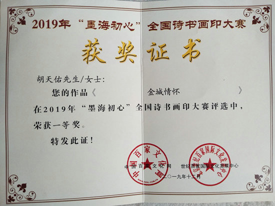 經(jīng)過(guò)緊張激烈的角逐,胡天佑作品《金城情懷》喜獲“墨海初心”全國(guó)詩(shī)書(shū)畫(huà)印大賽一等獎(jiǎng)。