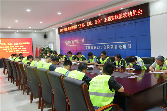 6月1日上午,中鐵一局京德高速ZT7標(biāo)項(xiàng)目召開(kāi)“五亮五比五創(chuàng)”主題實(shí)踐活動(dòng)動(dòng)員會(huì),項(xiàng)目部領(lǐng)導(dǎo)班子,全體黨員、積極分子、各部門(mén)負(fù)責(zé)人參會(huì),活動(dòng)由黨支部專(zhuān)職副書(shū)記趙海濤主持。