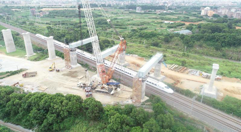 據了解,55-57號墩上跨既有杭深線,日行駛各類列車達314車次,36-39號墩上跨既有東吳支線,日辦理貨運列車9對,施工前需要與既有線產權單位進行溝通,協調難度大;此外,55-57號墩與杭深線立交角度17.1度,36-39號墩與東吳支線立交角度11.6度,均位于既有水溝外側,其中36號墩受周邊房屋影響,吊裝場地狹小,需精準計算履帶吊旋轉半徑,轉動后的后超起配重距離房屋僅30厘米,施工安全風險高;而且8月份臺風高發(fā),強風暴雨天氣對施工影響巨大,需實時關注天氣動態(tài),施工所受干擾多。