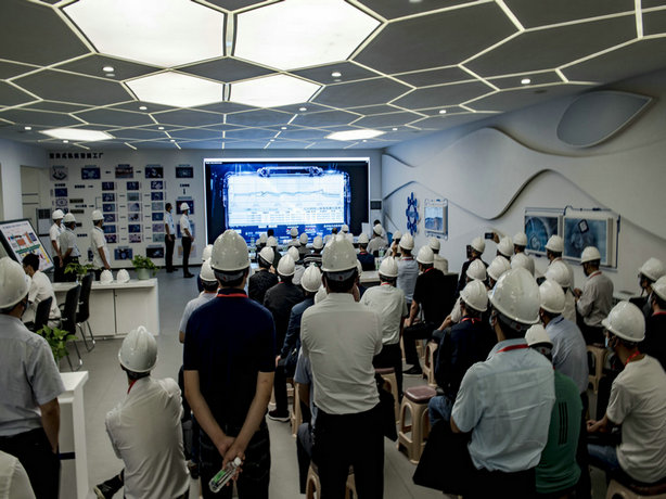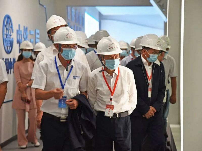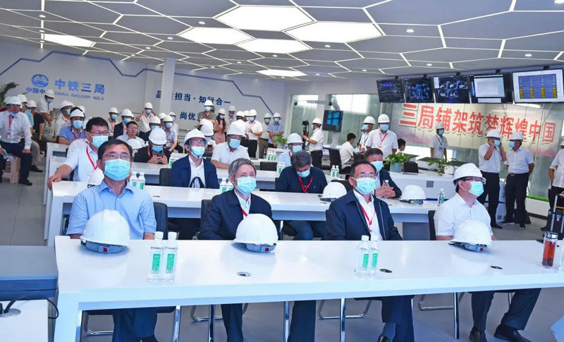 中國中鐵總工程師孔遁(左二)、中國中鐵高級專家朱本珍(左一)、中鐵三局總經(jīng)理李新遠(yuǎn)(左三)在智控中心