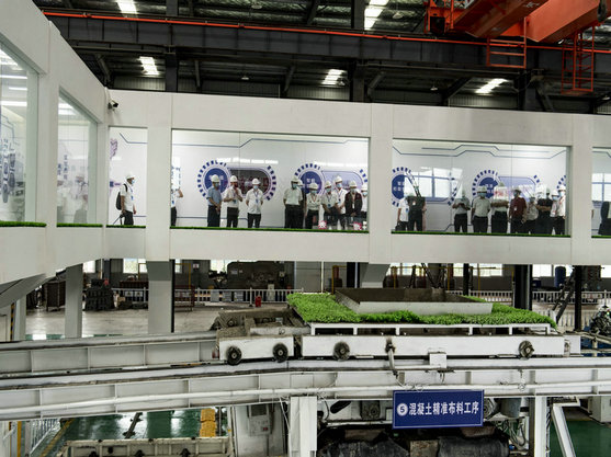 觀摩團(tuán)一行人觀光通道參觀車間自動化軌枕生產(chǎn)線