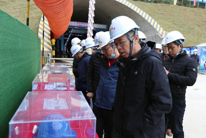 上午11時,江西省交通廳副廳長劉震華、江西省高速公路投資有限公司副總經(jīng)理俞文生、祁婺高速公路項目辦主任習(xí)明星、副主任戴程琳等領(lǐng)導(dǎo),帶領(lǐng)觀摩人員來到月嶺隧道進(jìn)口,聽取了中鐵二十一局三公司副總經(jīng)理張小衛(wèi)、項目負(fù)責(zé)人李蕓、項目總工程師陳志泉就月嶺隧道建設(shè)情況的匯報。左右線全長2401米的月嶺隧道是A1標(biāo)重點工程,在施工中采用先進(jìn)的“九臺套”組合設(shè)備,即:三臂鑿巖臺車、三臂立拱臺車、濕噴機械手、三維激光掃描儀、防水板鋪設(shè)臺車、二襯澆筑智能化監(jiān)控臺車、超前水平鉆、自動化二襯養(yǎng)護(hù)臺車、液壓電纜溝槽臺車等,實現(xiàn)了隧道施工流水化作業(yè)。并通過“三創(chuàng)新”和規(guī)范化作業(yè),保證了隧道施工的安全質(zhì)量和規(guī)范化、標(biāo)準(zhǔn)化,為打造業(yè)主提出的“品質(zhì)工程、品質(zhì)祁婺”創(chuàng)造了有利條件。