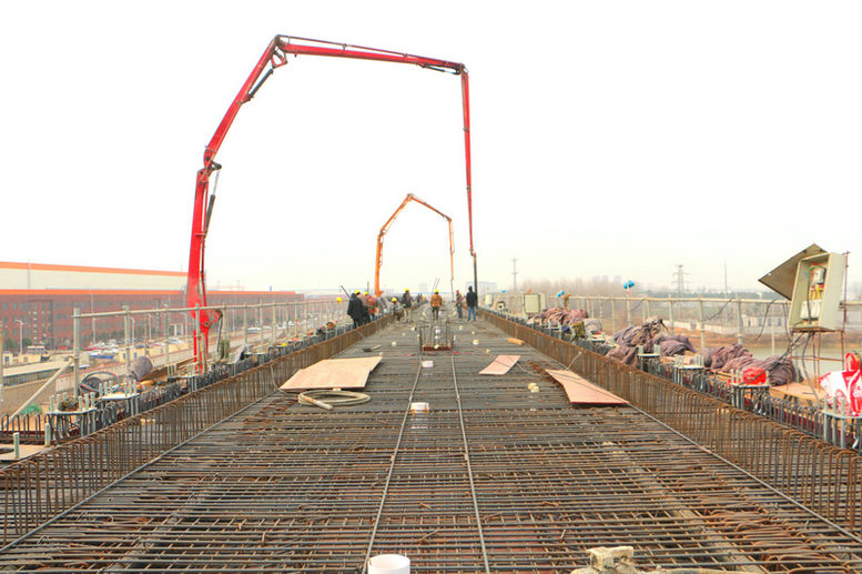 圖為武漢江北項(xiàng)目陽(yáng)大公路特大橋現(xiàn)澆連續(xù)梁澆筑施工現(xiàn)場(chǎng)