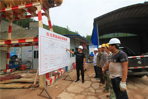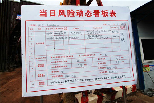 在中鐵二十一局集團(tuán)興泉鐵路XQXN-1標(biāo)六公司項(xiàng)目二分部承建的何屋2#隧道進(jìn)口洞門右側(cè),赫然矗立著這樣一個(gè)清晰醒目的看板;其中8月26日的一條警示說:作業(yè)工序:明洞施工;主要風(fēng)險(xiǎn)源:未按規(guī)定佩戴安全防護(hù)用品、臨邊防護(hù)不到位;風(fēng)險(xiǎn)等級(jí):低;注意事項(xiàng):防止高空墜落;風(fēng)險(xiǎn)控制措施:一是進(jìn)入現(xiàn)場(chǎng)作業(yè)人員必須佩戴安全防護(hù)用品;二是設(shè)立警示標(biāo)識(shí)牌;超前地質(zhì)預(yù)報(bào):當(dāng)前掌子面開展超前地質(zhì)預(yù)報(bào)有TSPC(地震波),加深炮孔,圍巖等級(jí)Va,較破碎,與設(shè)計(jì)相符,無異常。圍巖級(jí)別:Va,掌子面里程:DIK16+305:并明確公示現(xiàn)場(chǎng)負(fù)責(zé)人和現(xiàn)場(chǎng)監(jiān)理負(fù)責(zé)人。