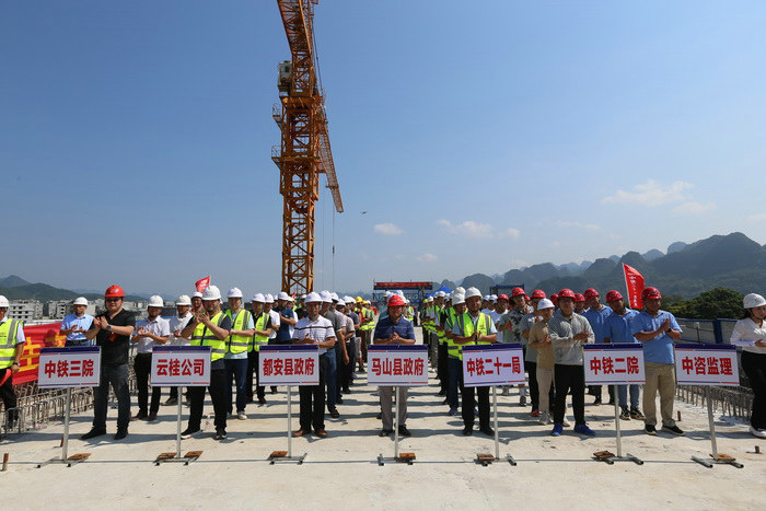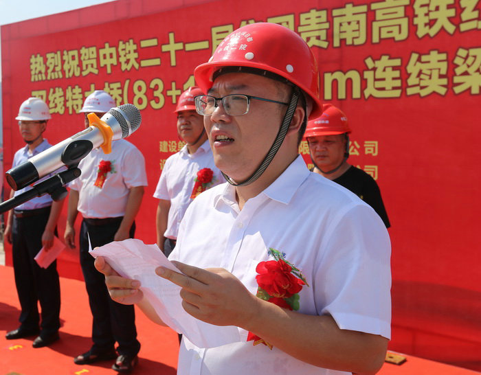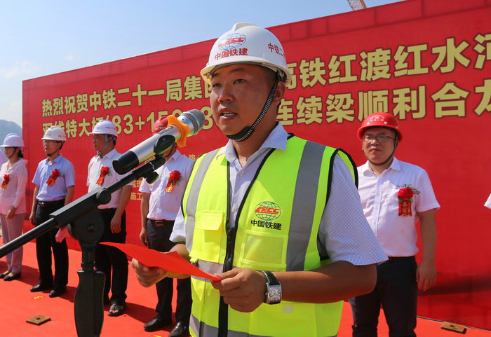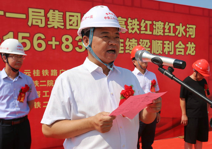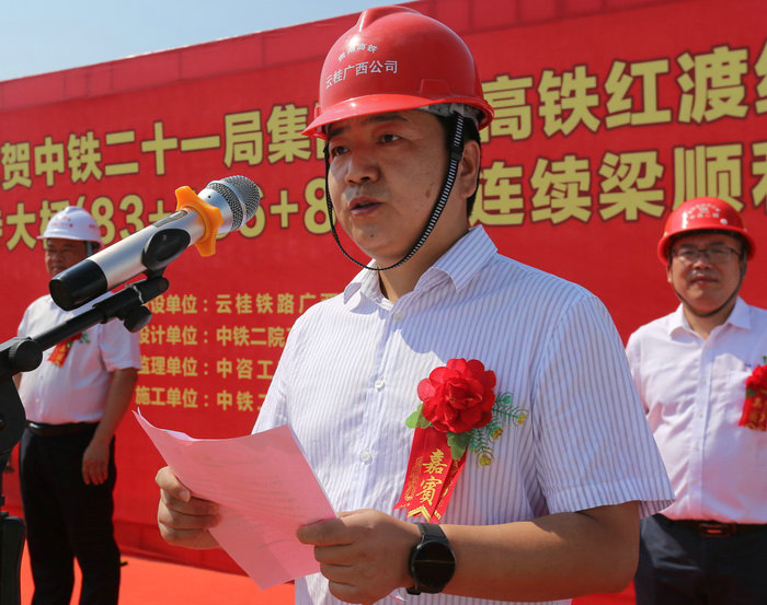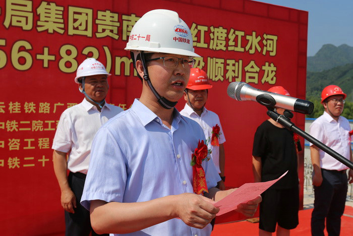 合龍慶典儀式,由中鐵二十一局集團(tuán)貴南高鐵8標(biāo)項目部常務(wù)副經(jīng)理衛(wèi)福星主持。首先由項目經(jīng)理池平平致辭,然后由一工區(qū)經(jīng)理張杰代表參建員工發(fā)言。中鐵二院南寧橋梁處處長韋國華、云貴鐵路廣西有限公司貴南高鐵建設(shè)指揮部指揮長周軍偉、都安縣政府黨組成員、貴南高鐵都安段征拆指揮部常務(wù)副指揮長藍(lán)景生、中鐵二十一局集團(tuán)公司黨委副書記、工會主席田愛平先后在合龍儀式上作了講話。