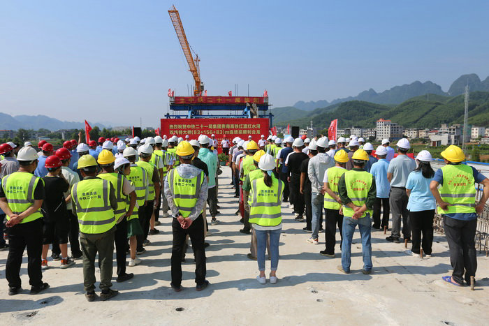 圖為合龍慶典儀式現(xiàn)場??????? 貴南高鐵項目沿線均為喀斯特地貌,溶洞、暗河密布,給橋梁樁基施工帶來了很大困難,尤其是對純混凝土大跨度橋梁,在沒有加勁拱、鋼管拱保持橋面線型穩(wěn)定的情況下,是對建橋施工技術(shù)的巨大突破。