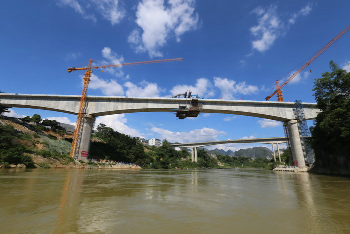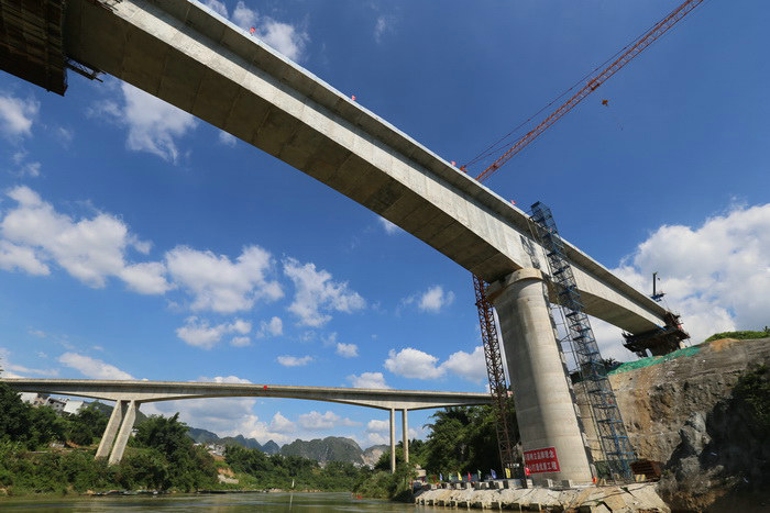 貴南高鐵紅渡紅水河雙線特大橋,位于廣西壯族自治區(qū)馬山縣與都安瑤族自治縣交界處,全長5776米,橋?qū)?2.6米,橋面至河面高度達(dá)70米。飛跨紅水河主河道的主橋,設(shè)計為一聯(lián)長達(dá)323.8米的純混凝土連續(xù)梁,其中99#至100#主跨為156米,是我國時速350公里的高速鐵路中,跨度最大的預(yù)應(yīng)力混凝土連續(xù)梁橋,被列為貴南高鐵全線的關(guān)鍵控制性工程之一。經(jīng)過施工、設(shè)計和科研單位協(xié)同攻關(guān),戰(zhàn)勝了高溫、雨季和疫情的干擾,在不中斷通航的前提下,按期實現(xiàn)高精度對接合龍,為我國在喀斯特地貌區(qū)域,特殊地質(zhì)條件下超大跨度混凝土連續(xù)梁在科研、設(shè)計和技術(shù)創(chuàng)新方面積累了寶貴的經(jīng)驗。