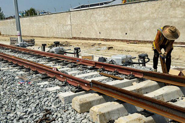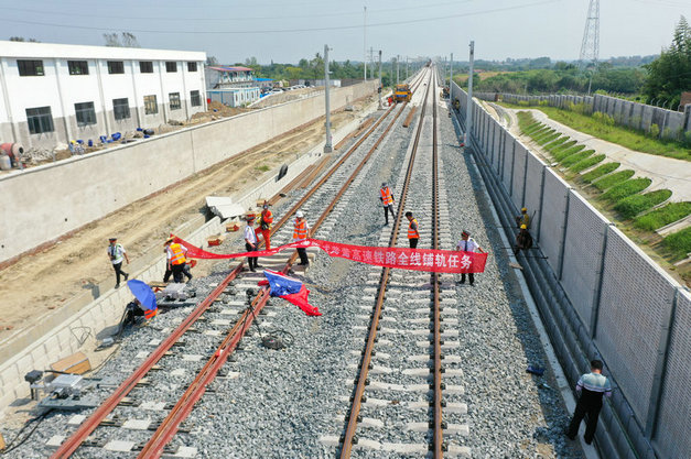 湖北黃岡訊 9月1日10時36分,在黃岡東站施工現(xiàn)場,隨著最后一組500米長軌平穩(wěn)落在無砟軌道板上,新建黃黃高速鐵路與武岡城際鐵路成功對接,標志著由中鐵三局線橋公司承擔的黃黃鐵路全線鋪軌任務全部完成,為黃黃鐵路開通運營奠定了堅實的基礎。