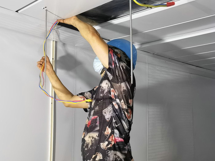 電工正在房間布線項(xiàng)目經(jīng)理劉維號表示。“援建方艙醫(yī)院是央企‘疫’不容辭的責(zé)任。這次搶建茅尾海方艙醫(yī)院,體量大、工期緊,是一場硬仗,我們要頂住壓力,分秒必爭,早日圓滿完成建設(shè)任務(wù)。”