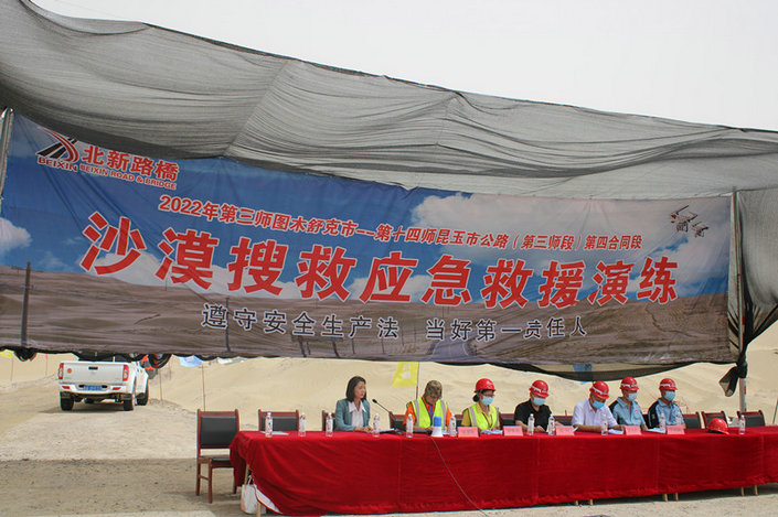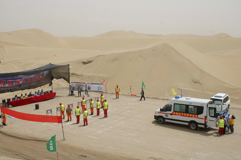 為給沙漠人員走失及高溫中暑情況下夯實(shí)基礎(chǔ),沙漠施工作業(yè)開個(gè)好頭,北新路橋圖昆公路項(xiàng)目第四標(biāo)段管理團(tuán)隊(duì)與第三師建設(shè)項(xiàng)目建管處緊密配合,在演練程序和細(xì)節(jié)上作了周密規(guī)劃和籌備。