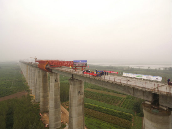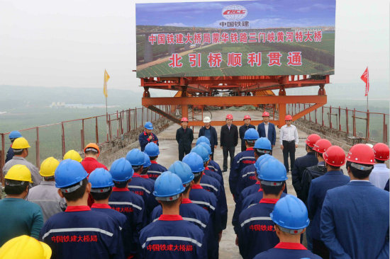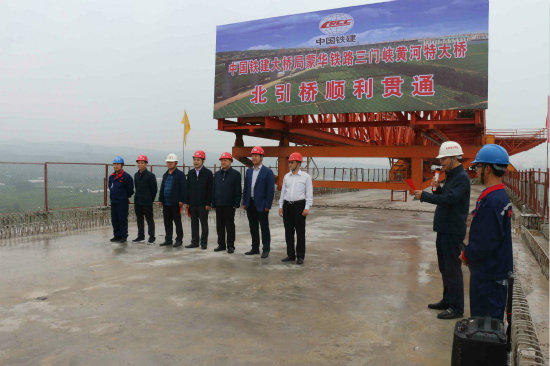 9月20日,中國鐵建大橋局西北公司承建的蒙華鐵路MHTJ-13標段三門峽黃河公鐵兩用大橋北引橋鐵路40m箱梁全部澆筑完成,這是重載鐵路大風(fēng)條件下的40米移動模架建造國內(nèi)首次,也標志著三門峽黃河公鐵兩用大橋北引橋順利貫通。中國鐵建大橋局集團副總經(jīng)理、總工程師宋偉俊,蒙華鐵路晉豫指揮部副指揮閆文樂,副總工程師耿長寶,四川鐵科監(jiān)理公司代總監(jiān)趙華,蒙華鐵路13標段指揮部總指揮李慶豐,西北公司黨委書記韓福堂以及項目全體參建職工共同見證了這一重要時刻。