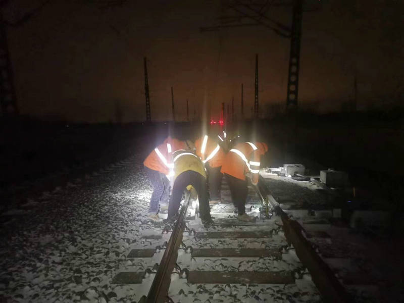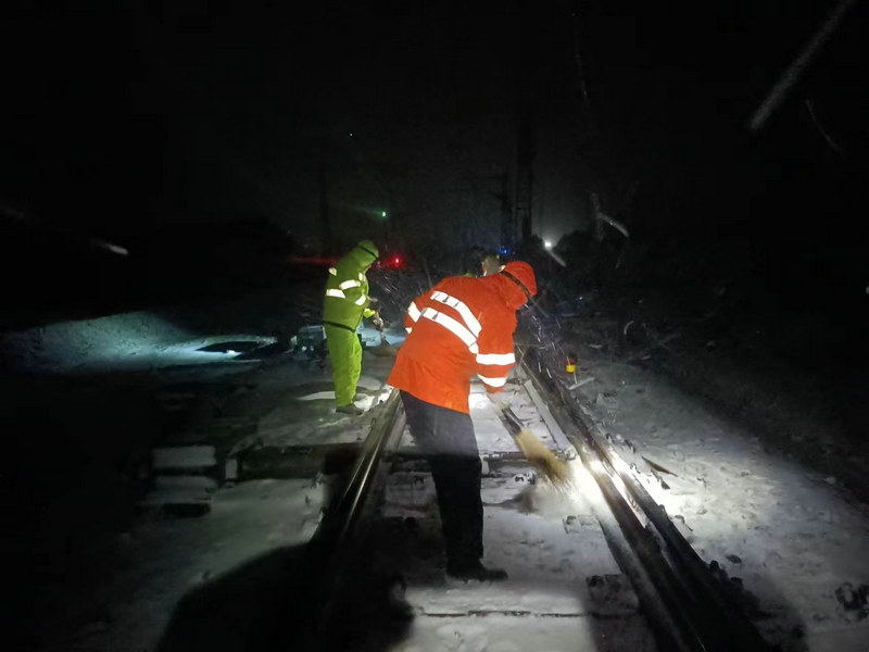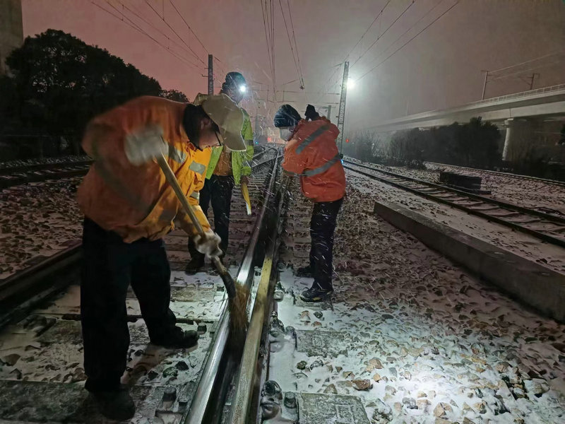 1月14日,皖西北地區(qū)迎來降溫、降雪過程,中國鐵路上海局集團(tuán)有限公司阜陽工務(wù)段亳州線路車間為確保京九線列車運(yùn)行安全暢通,自14日晚上到15日早上組織人員對各站場道岔進(jìn)行掃雪、除凍。