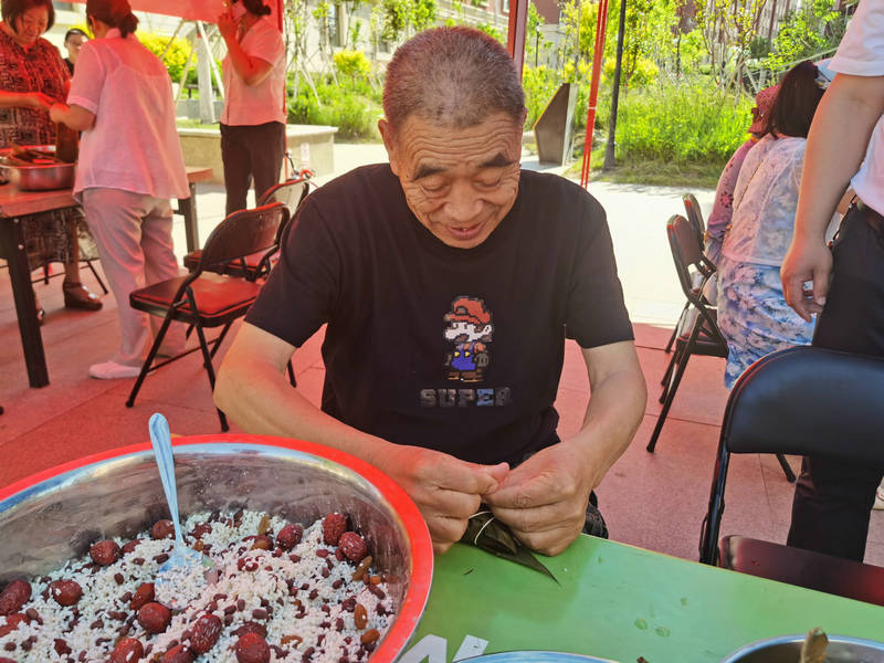 心靈手巧的張阿姨包的是標(biāo)準(zhǔn)的三角粽,十分漂亮,吸引了眾多業(yè)主,劉大爺學(xué)得認(rèn)真,張阿姨也教得細(xì)致,一邊教一邊講解要點(diǎn),“包粽子時(shí),粽葉面朝上,包時(shí)比普通的粽子多卷一圈,裝好米后然后上端要做成三角形的形狀才可將粽葉翻蓋下來……”劉大爺包時(shí)因怕用力不到位,叫旁人幫忙綁粽子,搞得拔河似的,惹得周圍的人忍俊不禁。