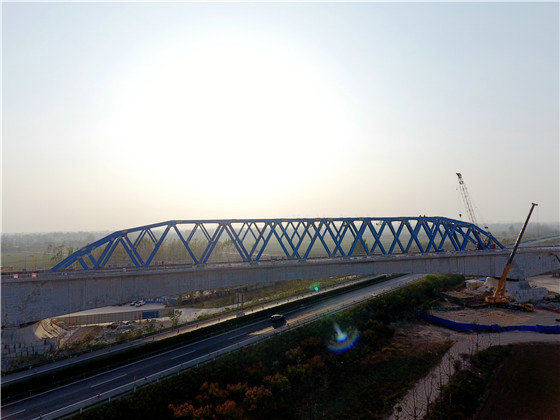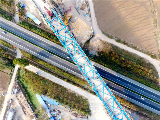 當(dāng)天,在鄭阜鐵路跨寧洛高速連續(xù)梁鋼桁梁拼裝施工現(xiàn)場(chǎng),遠(yuǎn)遠(yuǎn)就能看見(jiàn)一排高聳田間的高架橋,早已成為沃野間一道壯麗風(fēng)景線(xiàn)。眺望大橋,宛如一條藍(lán)色巨龍,橫貫G36寧洛高速,為豫東門(mén)戶(hù)再添新的靚麗風(fēng)景,橋下依然滿(mǎn)是川流不息的來(lái)往車(chē)輛,看似“親密”但又互不影響。