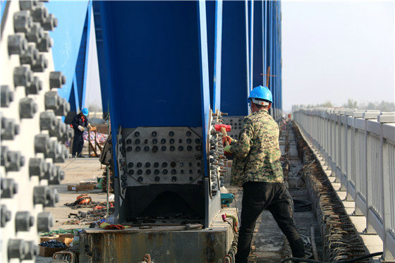 “為確保該連續(xù)梁橋各節(jié)點(diǎn)目標(biāo)順利實(shí)現(xiàn),中鐵一局鄭阜鐵路項(xiàng)目部不斷優(yōu)化施工方案,開(kāi)展多項(xiàng)科技攻關(guān),多次組織相關(guān)專(zhuān)家進(jìn)行技術(shù)方案研討論證,有效針對(duì)超高大節(jié)段0號(hào)塊施工、鋼桁節(jié)點(diǎn)板精準(zhǔn)預(yù)埋、超大跨度連續(xù)梁線(xiàn)性控制、鋼桁梁制作及拼裝等諸多困難,制定切實(shí)、可靠、安全高效的施工方案,并嚴(yán)格執(zhí)行。后經(jīng)相關(guān)監(jiān)控單位測(cè)量,項(xiàng)目拼裝完成后的曲弦鋼桁梁桁高、節(jié)點(diǎn)長(zhǎng)度偏差均在1.5毫米,主桁中心距對(duì)角線(xiàn)偏差2毫米,全橋鋼桁拼裝精度高,各項(xiàng)檢測(cè)指標(biāo)均符合設(shè)計(jì)要求,實(shí)現(xiàn)由“紙上藍(lán)圖”變“地上通途”。”項(xiàng)目總工程師張洪偉介紹道。