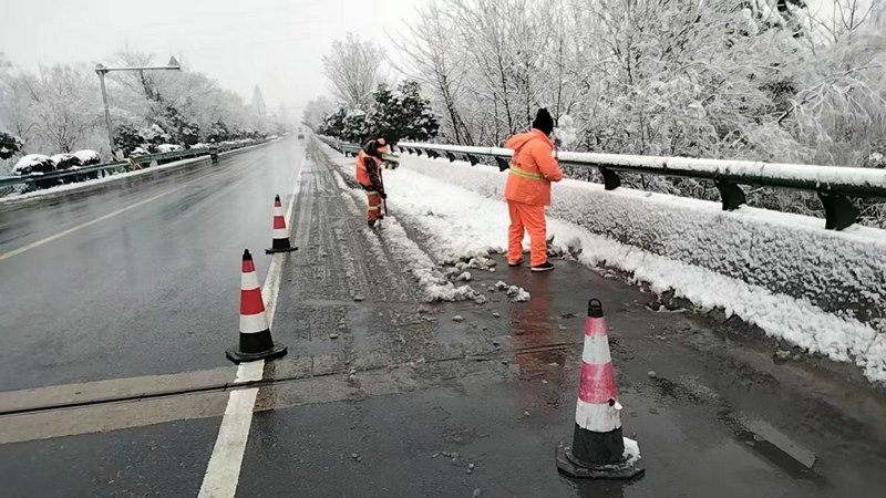 北新路橋集團華東分公司廣德市老S215、G233道路養(yǎng)護市場化工程項目認真貫徹落實相關(guān)要求,積極調(diào)配應(yīng)急物資、排查疏通沿線排水設(shè)施、保養(yǎng)預(yù)熱機械設(shè)備至最佳狀態(tài),做好清除路面積雪的準備工作。降雪后,項目部全體人員不畏嚴寒,投放融雪劑、防滑沙等,清掃養(yǎng)護路段積雪、結(jié)冰,開辟出了一條安全整潔的道路。