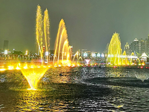 秋水廣場噴泉——亞洲第一音樂噴泉。南昌秋水廣場音樂噴泉位于南昌市紅谷灘新區(qū)贛江之濱的中心地帶,與滕王閣隔江相望。它是亞洲較大的音樂噴泉群,共配置了中心主噴、環(huán)形高噴、圓形搖擺噴泉和數(shù)控跑泉等20余個水景,是南昌市一靚麗景觀。如無意外的話是每天都有的,這噴泉更被稱為亞洲第一噴泉。噴泉包括中心主噴、環(huán)形高噴、圓形搖擺噴等水景。每天晚上19:30-19:45、20:30-20:45,噴泉都會準(zhǔn)時噴放,一束束水柱沖天而起,形狀多樣,五彩繽紛,而且加上激光、投影,更顯得精彩萬分,異常漂亮,吸引了眾多游人前來觀看。噴泉最高主噴更是高達(dá)128米,時間大概有15分鐘。