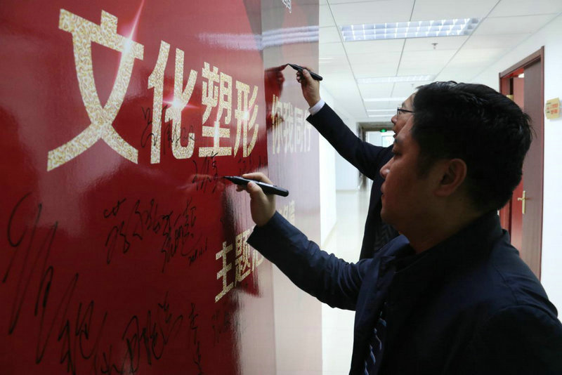 本期道德講堂設(shè)有主題簽名、看宣傳片、唱歌曲、講故事、誦經(jīng)典、送吉祥六個(gè)環(huán)節(jié)。下午13時(shí),參加活動(dòng)的職工陸續(xù)來到簽名墻前,用筆簽下了自己的一份承諾,拉開了活動(dòng)的序幕。