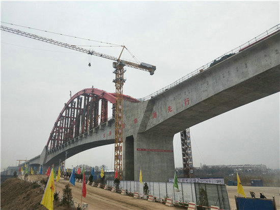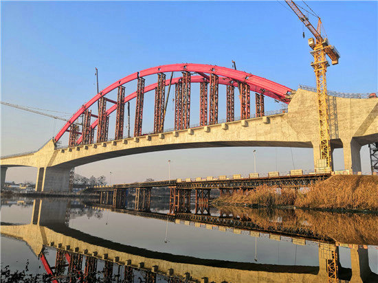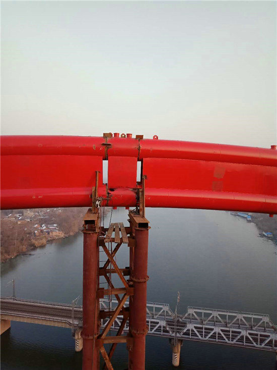 鋼管拱的順利合龍,在商合杭鐵路全線2座同類型同跨度的橋梁中,以優(yōu)于其他標(biāo)段的安裝效果、小于其他標(biāo)段的工期,以優(yōu)異的成績?yōu)榧瘓F(tuán)公司、五公司交出一份滿意的答卷、為安徽亳州人民渦河上架起一座高鐵“彩虹”。