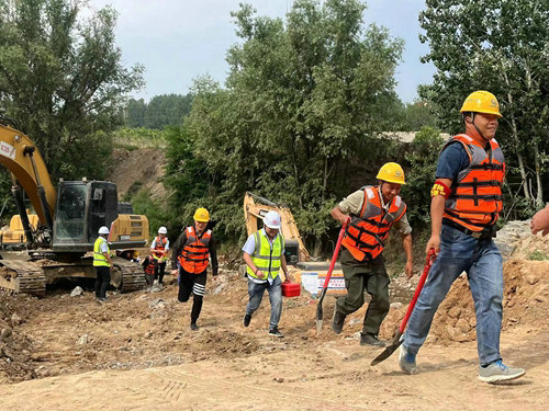 當天,演練模擬巡河員發(fā)現(xiàn)上游因強降雨導(dǎo)致水位上漲且水質(zhì)渾濁,汛情預(yù)計30分鐘后到達施工區(qū)域情景,接到報告后,應(yīng)急領(lǐng)導(dǎo)小組組長立即啟動應(yīng)急預(yù)案,在組長的安排指揮下,搶險組加固土坡、裝沙袋、運沙袋,同時組織挖機修復(fù)便道,恢復(fù)交通;疏散警戒組檢查河道內(nèi)有無施工人員,機械設(shè)備及村民,有無阻礙泄洪的障礙物,對周邊實行警戒,組織指揮交通,確保救援道路暢通和人員安全撤離。