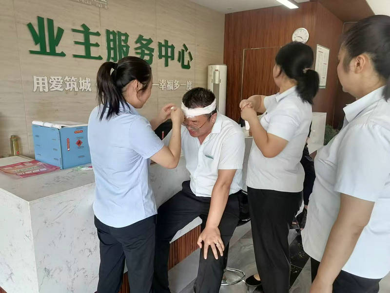 物業(yè)工作人員身著整齊制服,手持專業(yè)治安裝備,嚴(yán)陣以待。演練中,物業(yè)人員對(duì)占道經(jīng)營(yíng)攤販進(jìn)行勸阻時(shí)發(fā)生爭(zhēng)執(zhí)并引發(fā)沖突斗毆。見(jiàn)狀,他們立即上前制止,迅速將攤販攔截控制,成功解除危機(jī)。此外,在基本醫(yī)療保障方面,物業(yè)人員也展現(xiàn)出專業(yè)應(yīng)急處置能力,手法堪比醫(yī)護(hù)人員。