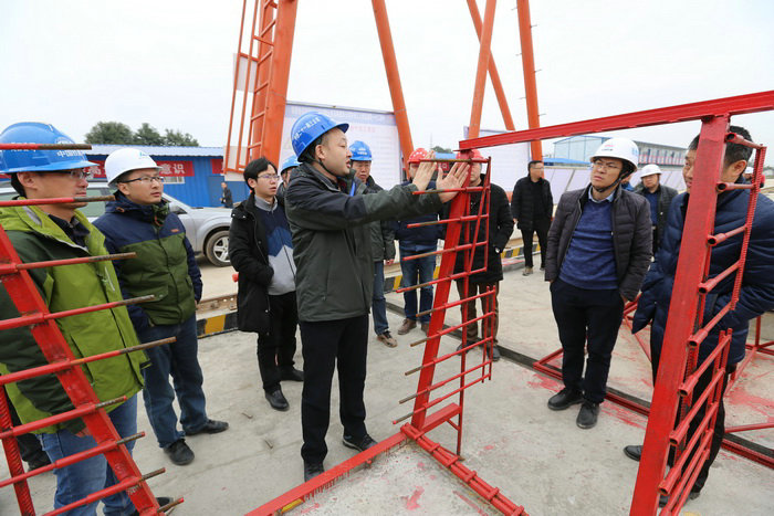 項目班子成員與督查組領(lǐng)導(dǎo)現(xiàn)場交流 督查組到施工現(xiàn)場的第一站是制梁場。占地30多畝的制梁場已建設(shè)完工,即將進(jìn)行首片梁預(yù)制。兩臺紅色的龍門吊、幾十個制梁臺坐、鋼筋安裝綁扎胎模、幾套綠色嶄新的制梁模板已安裝就位。該梁場承擔(dān)著28座大中小橋共644片箱梁、T梁的預(yù)制任務(wù)。在制梁場,項目經(jīng)理楊斌、總工李偉鋒為督查組詳細(xì)介紹了梁場建設(shè)情況。督查組對綁扎鋼筋胎模上的卡具產(chǎn)生了興趣,經(jīng)理楊斌作了仔細(xì)解釋:“我們創(chuàng)新安裝卡具的目的,就是嚴(yán)格控制每根鋼筋的間距,做到不差分毫,使鋼筋布置受力完全符合設(shè)計標(biāo)準(zhǔn)。”質(zhì)監(jiān)局的一位領(lǐng)導(dǎo)聽后,稱贊說這個創(chuàng)意很好。