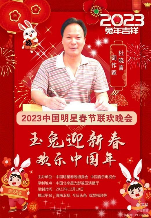 杜曉言,軍旅詞作家,騰訊音樂(lè)人,中國(guó)音樂(lè)著作權(quán)協(xié)會(huì)會(huì)員,中國(guó)職工攝影家協(xié)會(huì)會(huì)員,《鐵路工程建設(shè)網(wǎng)》通訊員,《大眾原創(chuàng)詩(shī)詞網(wǎng)刊》簽約作家,《美篇旅游》顧問(wèn)等。1962年11月山東鄆城生人。1981年10月參加鐵道兵,1984年1月隨鐵道兵集體兵轉(zhuǎn)工。迄今在《中央電視臺(tái)》《內(nèi)蒙古衛(wèi)視》《海南衛(wèi)視》《山西衛(wèi)視》《安徽衛(wèi)視》《河南衛(wèi)視》《中國(guó)國(guó)際廣播網(wǎng)》《廣西廣播網(wǎng)》《QQ音樂(lè)》等演唱作詞歌曲100多首。在《詞刊》《歌曲》《廣播歌選》《解放軍歌曲》《重慶音樂(lè)》《上海歌聲》等發(fā)表歌詞500多首,創(chuàng)作歌詞3000多首。作詞歌曲代表作《再唱美麗的草原我的家》《天路新歌》《我的中國(guó)》《祖國(guó),我為你自豪》《生生死死都愛(ài)你》《愛(ài)上你就不后悔》《夢(mèng)中的哈達(dá)》《《江南水鄉(xiāng)》《水鄉(xiāng)江南》《不老情緣》《紅塵不了情》《謝謝你伸手拉過(guò)我》《遠(yuǎn)方的阿哥你好嗎》《江南美》《美麗的牽掛》《我的江南》《筑路的哥哥走四方》等,作詞歌曲《西雙版納的歌謠》《壯鄉(xiāng)三月春光美》等多首作詞歌曲改編葫蘆絲名曲廣為流傳,《我的中國(guó)》《祖國(guó),我為你自豪》《最暖的陽(yáng)光》等多首作詞歌曲參加大型文藝晚會(huì)并獲獎(jiǎng),《水鄉(xiāng)江南》《走壯鄉(xiāng)》等多首作詞歌曲收入大學(xué)音樂(lè)教材。與張雷雷、于天海等合作電影《落潮灣》主題歌《落潮灣戰(zhàn)事》,電視劇《蜀漢戰(zhàn)神傳》主題歌《英雄無(wú)淚》、電影《大漠較量》主題歌《駝鈴駱駝草》等多部影視劇主題歌。著有《情感家園》《選擇美好》等多部歌詞專著。自學(xué)成才事跡在《人民日?qǐng)?bào)》《工人日?qǐng)?bào)》《中國(guó)新聞網(wǎng).香港》等多家媒體報(bào)道!