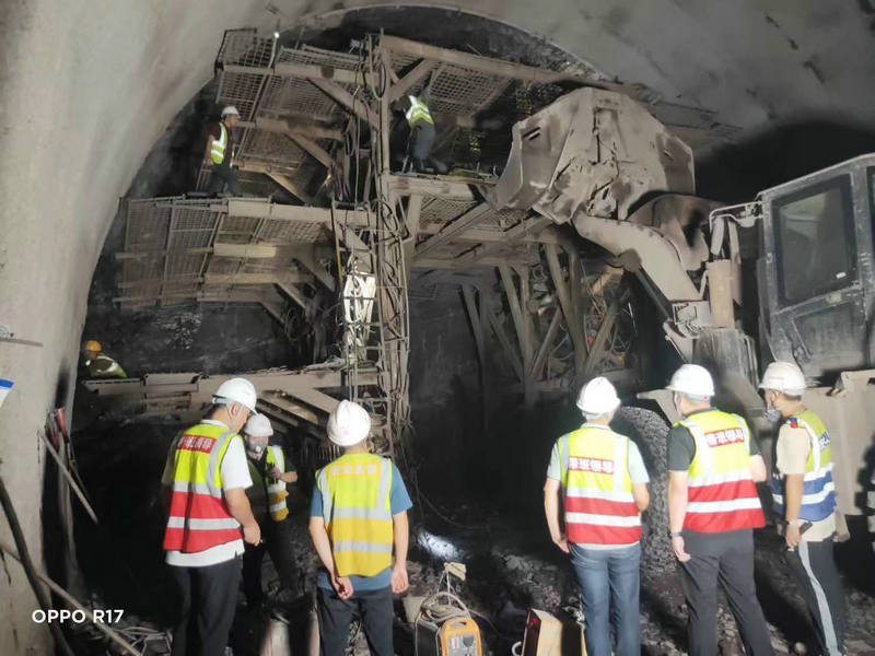 中秋夜,項(xiàng)目經(jīng)理阮超(中)帶隊(duì)在中梁山隧道進(jìn)口小里程左線掌子面夜查