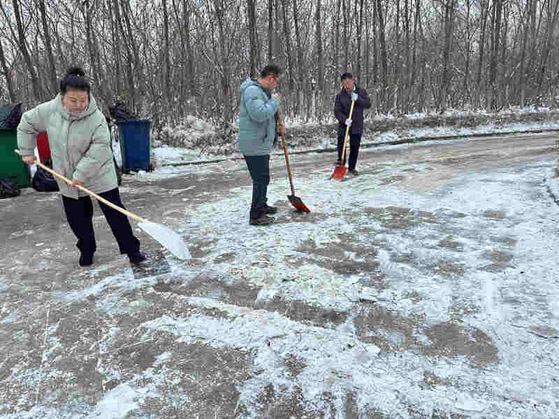 為盡快恢復(fù)道路暢通,工作人員們不顧嚴(yán)寒,齊心協(xié)力,鏟的鏟、掃的掃,干得熱火朝天。有的地方積雪被車輛壓實(shí),清理難度極大,工作人員們便幾人一組,用鐵鍬先將積雪敲碎,再合力鏟起。他們的雙手被冰冷的工具磨得通紅,甚至磨出了水泡,但沒有一個人停下手中的動作。經(jīng)過數(shù)小時(shí)的奮戰(zhàn),北新大廈的主要道路積雪被清理干凈,為業(yè)主的出行開辟出了一條條安全通道。