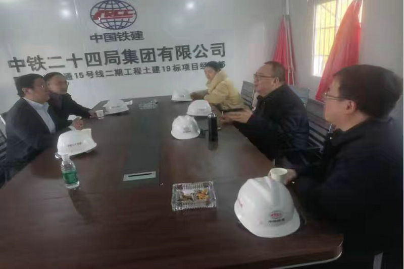 總承包部指揮長李兵(右2)與分管軌道工程項(xiàng)目領(lǐng)導(dǎo)徐新明(左1)、項(xiàng)目經(jīng)理王磊(左2)