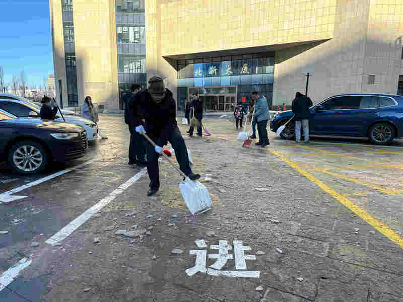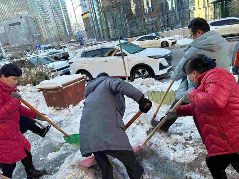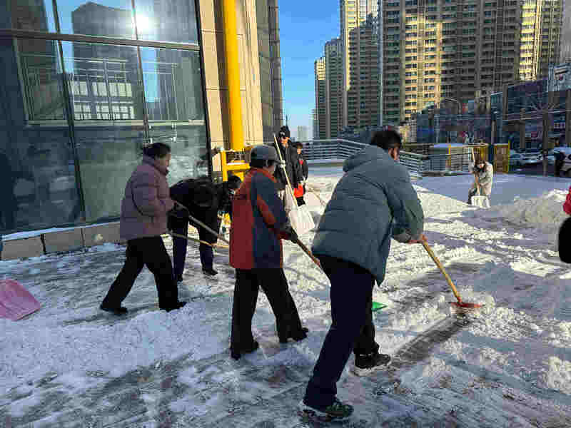 為保證周一早上北新大廈業(yè)主們的正常出勤,天還未亮,物業(yè)工作人員便已全員集合,手持鐵鍬、掃帚等工具,奔赴大廈各條道路與公共區(qū)域。寒風(fēng)刺骨,雪花不斷打在臉上,但他們毫不在意,鐵鍬鏟雪聲、掃帚清掃聲交織在一起,奏響了一曲冬日的勞動(dòng)樂章。有的地方積雪深厚,工作人員們齊心協(xié)力,一鍬一鍬地將雪鏟起,堆積到路邊;有的區(qū)域冰層堅(jiān)硬,他們便用鐵鎬小心地敲碎,再仔細(xì)清掃干凈,確保路面不留積雪與暗冰。