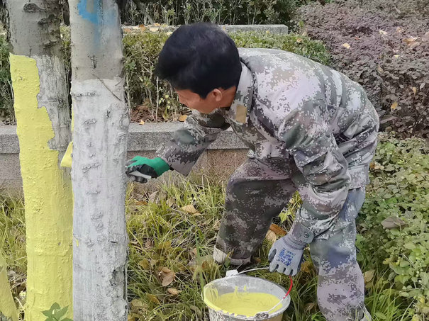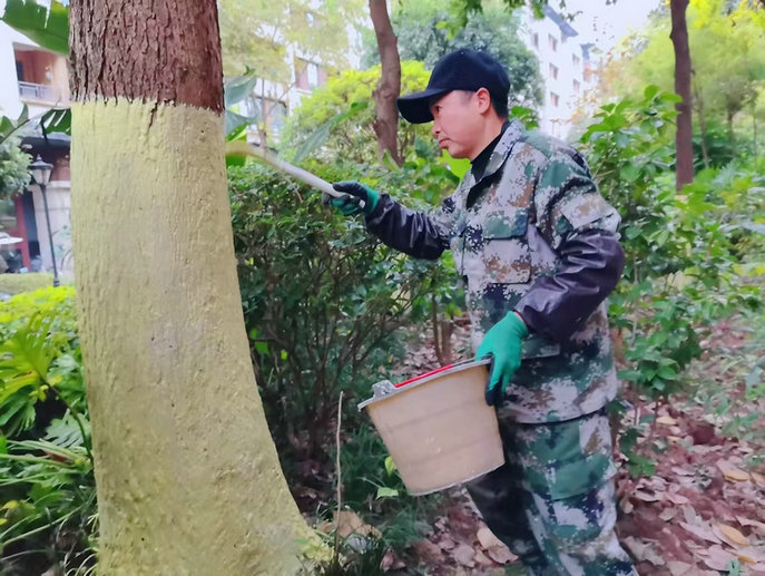 重慶合川訊(通訊員 湯英勇)隨著氣溫的逐漸下降,園林植物開始進入冬季生長休眠期,為強化綠化植物養(yǎng)護管理,全力確保綠化植物安全越冬,近日,冬季樹木刷白防護工作全面啟動。宜邦物業(yè)園林工作搶抓天氣晴好的有利時機,對御龍灣小區(qū)內(nèi)所有的樹木進行涂白防護。