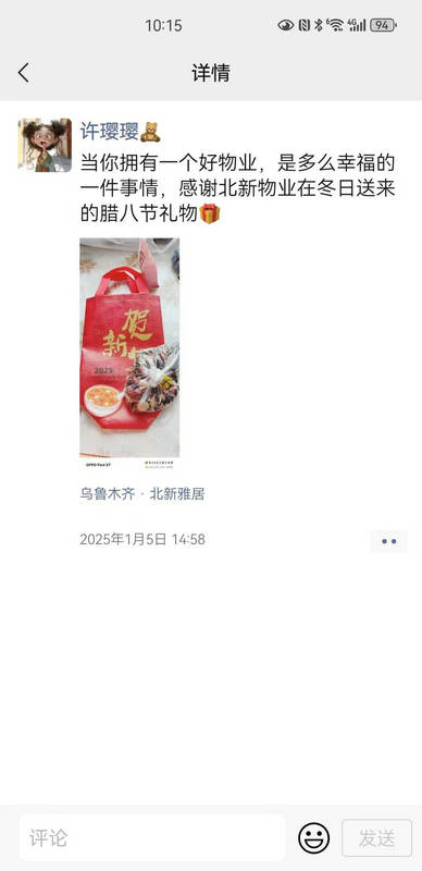 此次臘八送粥活動(dòng),不僅讓業(yè)主們?cè)诤涞亩绽锲穱L到了傳統(tǒng)美食,更是拉近了物業(yè)與業(yè)主之間的距離,增強(qiáng)了社區(qū)的凝聚力和歸屬感。北新雅居宜邦物業(yè)負(fù)責(zé)人表示,今后將繼續(xù)秉持“業(yè)主至上,服務(wù)第一”的理念,舉辦更多類似的暖心活動(dòng),為業(yè)主們營(yíng)造溫馨、和諧、美好的居住環(huán)境,與業(yè)主攜手共度每一個(gè)溫暖的節(jié)日和美好的時(shí)光。