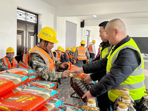 在項(xiàng)目會(huì)議室,王慶一行將節(jié)前為勞務(wù)工精心準(zhǔn)備的大米、食用油等生活物資以及節(jié)日慰問品逐一送到了勞務(wù)工及及家屬手中。慰問組與勞務(wù)工朋友們進(jìn)行了親切的交流,深入了解了他們的工作和生活狀況,對勞務(wù)工在社會(huì)發(fā)展中所作出的貢獻(xiàn)表示感謝,并向他們致以新春的祝福。