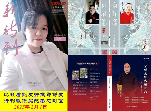 三、《中國先鋒作家詩人》是由甘肅文學(xué)網(wǎng)主辦,《先鋒詩人網(wǎng)絡(luò)詩選》微信詩刊協(xié)辦的純詩歌交流刊物,現(xiàn)定為季刊。由于征稿和評選出版的緣故,征文期限為三個月一季,旨在發(fā)掘和推廣全國范圍內(nèi)高質(zhì)量的詩歌作品,打造國內(nèi)一流的詩人、作家平臺。在《中國先鋒作家詩人》2024年特別???025年春節(jié)后發(fā)行)上,刊登有《一雙鐵手擎巨筆(現(xiàn)代詩)——讀<不朽的軍魂·人物風(fēng)采卷>有感》《鐵腳趟過南疆的硝煙(現(xiàn)代詩)——讀姚尚明著<南疆硝煙>有感》《為了那段不朽的履歷(現(xiàn)代詩)——讀姚尚明<中原筑路>有感》《鐵手書寫履歷(現(xiàn)代詩)——讀陳巽之<苔花米小牡丹開>有感》《李白哼出新曲(現(xiàn)代詩)——讀陳巽之<鴻爪雪泥集>有感》《風(fēng)雨里感悟人生(現(xiàn)代詩)——讀向溫華<風(fēng)雨人生>有感》《鐵兵人,就喝鐵兵頌酒(現(xiàn)代詩)》《青春年華十四載(現(xiàn)代詩)——讀郭冠杰主編<大地做紙寫春秋>有感》《埋頭將文字排列成行(現(xiàn)代詩)——讀謝克強(qiáng)<藝術(shù)之光>有感》《尋光之旅(現(xiàn)代詩)——讀謝克強(qiáng)<尋找詞的光芒>有感》《堅(jiān)持在詩海中航行(現(xiàn)代詩)——讀鄒敢昆<萬里行吟>有感(二)》和《難忘入黨時……(現(xiàn)代詩)》共12首詩歌作品。