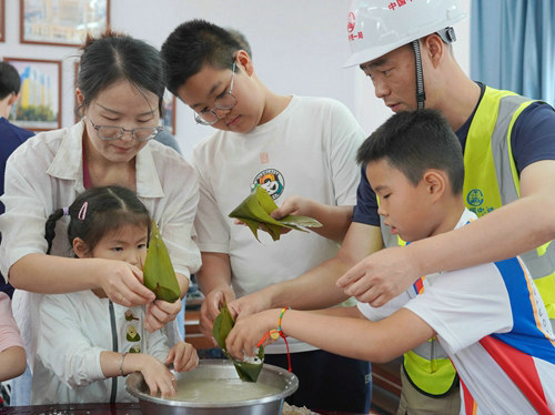 在包粽子環(huán)節(jié)中,項(xiàng)目部為孩子們現(xiàn)場(chǎng)準(zhǔn)備了粽葉、糯米、紅棗、豆沙等多種食材,家長(zhǎng)與孩子默契配合開(kāi)始包粽子,捋粽葉、填餡料、扎棉線,一個(gè)個(gè)飽含愛(ài)意的粽子很快成型。孩子們捧著自己的勞動(dòng)成果,成就感滿滿。