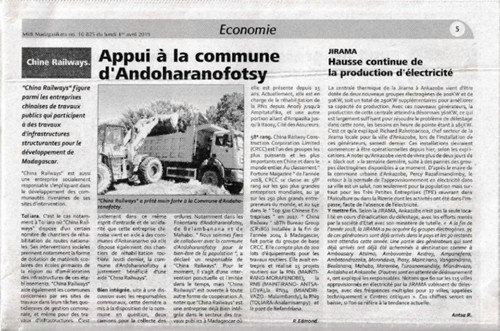 近日,馬達(dá)加斯加主流媒體MIDI稱贊中鐵十八局集團(tuán)馬達(dá)加斯加公司是一家具有高度社會(huì)責(zé)任感的公司,為當(dāng)?shù)厝嗣裉峁┝酥T多幫助。多年來(lái),中鐵十八局集團(tuán)馬達(dá)加斯加公司在建好項(xiàng)目的同時(shí),多次無(wú)償為附近學(xué)校捐贈(zèng)學(xué)習(xí)用品,幫助清理學(xué)校場(chǎng)地,維護(hù)公共基礎(chǔ)設(shè)施。日前義務(wù)為承建的塔娜市政工程附近村鎮(zhèn)清理生產(chǎn)生活垃圾,使村鎮(zhèn)居民的生活環(huán)境更加舒暢清潔。