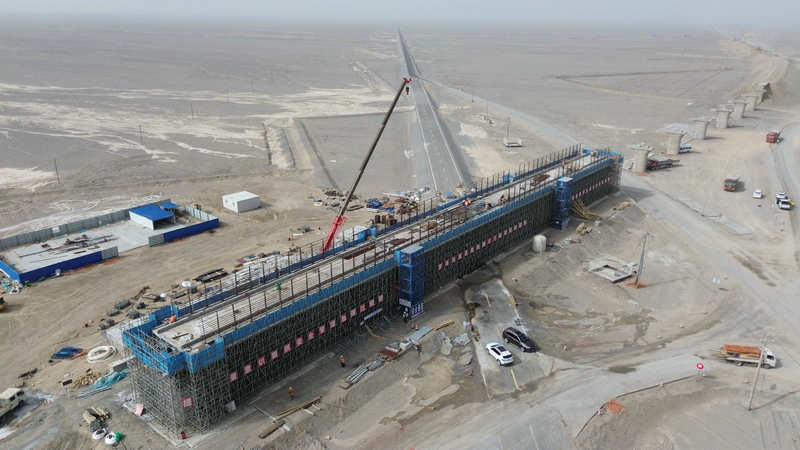 6月7日,羅布泊戈壁腹地,隨著最后一車混凝土精準(zhǔn)入模,中鐵二十一局承建的羅若鐵路S2標(biāo)段S235線大橋連續(xù)梁順利合龍。標(biāo)志著該控制性工程取得了階段性的突破,為后續(xù)架梁、鋪軌施工奠定了堅(jiān)實(shí)的基礎(chǔ)。