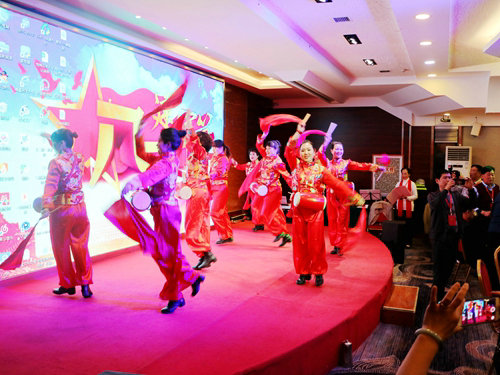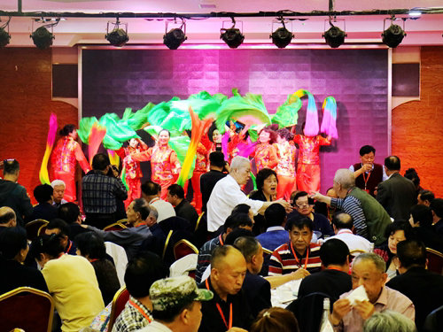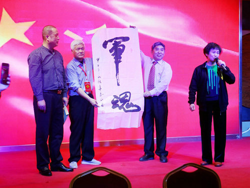 軍歌之后,全體起立。首先向抗美援朝、援越抗美、自衛(wèi)反擊戰(zhàn)中和參加祖國鐵路建設(shè)中犧牲的戰(zhàn)友們默哀。陜西省鐵道兵聯(lián)誼會常務(wù)副會長凌永明、秘書長王抗林、副秘書長查新年、鐵兵服務(wù)社副主任康福順受會長王紅旗的委托到會致賀詞,并贈送了書畫作品;四川涼山州會東戰(zhàn)友團和原鐵道兵2師6團衛(wèi)生隊戰(zhàn)友團分別贈送了賀旗。會議由尚仲鳴戰(zhàn)友主持。組委會秘書長趙民朝對大會籌備情況及聯(lián)誼活動的注意事項做出說明;組委會副會長李滿生介紹參加聯(lián)誼會活動的主要領(lǐng)導;組委會常務(wù)副會長胡小安戰(zhàn)友代表組委會致歡迎詞;活動的發(fā)起人、組委會會長王青年講話并致祝酒詞。他們雖然口音不同,南腔北調(diào),但所表達的戰(zhàn)友之情情真意切,感天動地。其中,住在西安的原鐵道兵2師9團宣傳股長裴光琪戰(zhàn)友聽說兄弟部隊的戰(zhàn)友在西安聚會,及時率領(lǐng)著一幫文藝工作者趕來義演助興,送上了一臺富有西北特色的歌舞;灃華國際酒店的員工自發(fā)組隊也臨時上臺表演了精彩的舞蹈《快樂崇拜》和《抓錢舞》。戰(zhàn)友們各顯其能,李文太戰(zhàn)友的二胡獨奏《一壺老酒》、劉務(wù)光戰(zhàn)友贈送的書法作品、李桂專戰(zhàn)友的快板書《鐵道兵情誼濃》、電子琴獨奏《我是一個兵》、笛子獨奏《英雄神槍手》和龍城風戰(zhàn)友的紅歌獨唱《瀏陽河》等引來戰(zhàn)友們的陣陣掌聲。