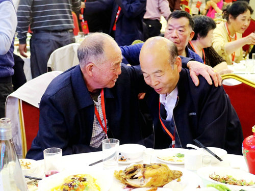 40多年彈指一揮間,此時此刻,這些老戰(zhàn)友們仿佛置身于時光隧道,倒擋穿越,一個個陌生的面孔,頓時變的生龍活虎,真真切切,展現(xiàn)在他們的眼前!遺憾的是,人生易老天難老啊,昔日英俊的容顏不再,今天滿臉溝壑縱橫,擎蒼之頂,黑發(fā)雪染,兩鬢斑白!歲月蒼狗,不盡人意,老去的是容顏,固化的是友情,殷殷常懷戰(zhàn)友情,念念難忘長者風,他們的心依然是青年!新來的見到先到的,大眼瞪小眼,“你是……?”“好好想想。”被“瞪”的戰(zhàn)友笑眼咪咪。當終于說出名字后,才忍不住相互上前,緊握雙手——“你也老了呀。”淚眼模糊中,撒開雙手,緊緊相擁。那種心靈的契合,是旁人難以理解的。