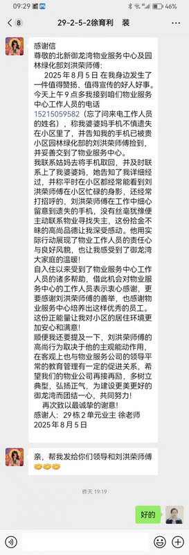 物業(yè)服務(wù)中心項(xiàng)目二部主管接到手機(jī)后,通過(guò)手機(jī)內(nèi)的 “敬老卡” 信息,迅速鎖定失主為三街區(qū) 29-2-5-2 的徐育利,并及時(shí)聯(lián)系其前來(lái)領(lǐng)取。當(dāng)徐育利得知撿到手機(jī)的是平日工作認(rèn)真負(fù)責(zé)、待人熱情的劉洪榮師傅時(shí),難掩激動(dòng)之情:“劉師傅平時(shí)修剪園林就一絲不茍,這次還主動(dòng)歸還手機(jī),太讓我感動(dòng)了!” 當(dāng)晚,便寫下感謝信,為劉洪榮的善舉點(diǎn)贊,也向北新宜邦物業(yè)培養(yǎng)出這樣的優(yōu)秀員工致謝。?