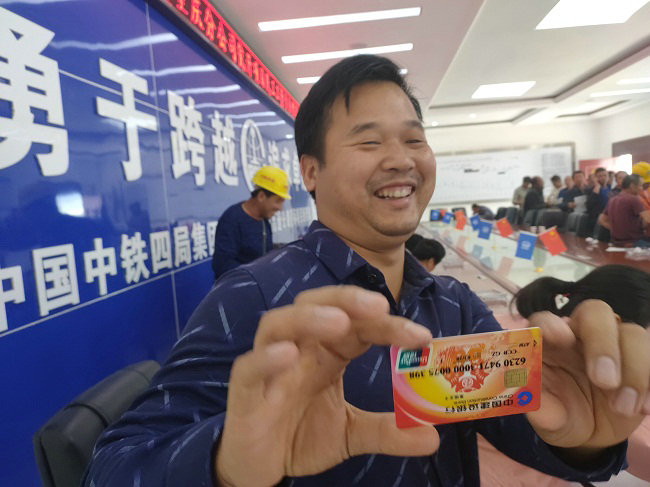 屋內(nèi)熱火朝天,一位剛激活工資卡的湖南小伙李中輝說(shuō)道:“很開心,在很多工地工作過(guò),這是第一次享受這個(gè)待遇,在工作人員的耐心指導(dǎo)下,我知道怎么使用網(wǎng)銀。”另一位重慶工友蔡光明也表示“很貼心,項(xiàng)目部工會(huì)能把銀行‘帶來(lái)工地’方便多了,有了這張卡片,進(jìn)賬出賬都有短信提醒,我感到很安心、放心。我在這個(gè)工地,更加有了擼起袖子加油干的決心和信心。”