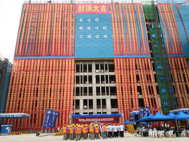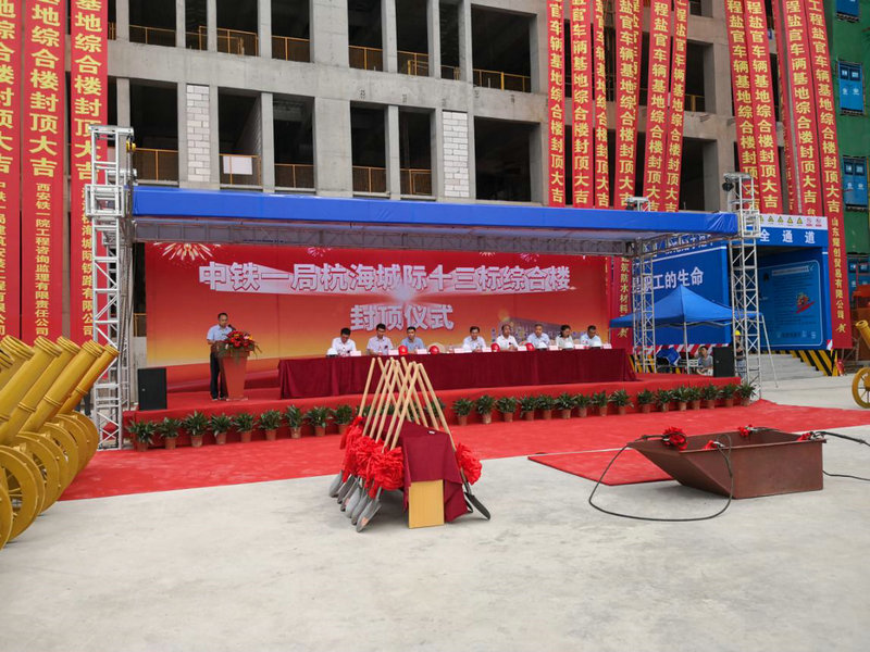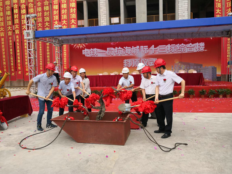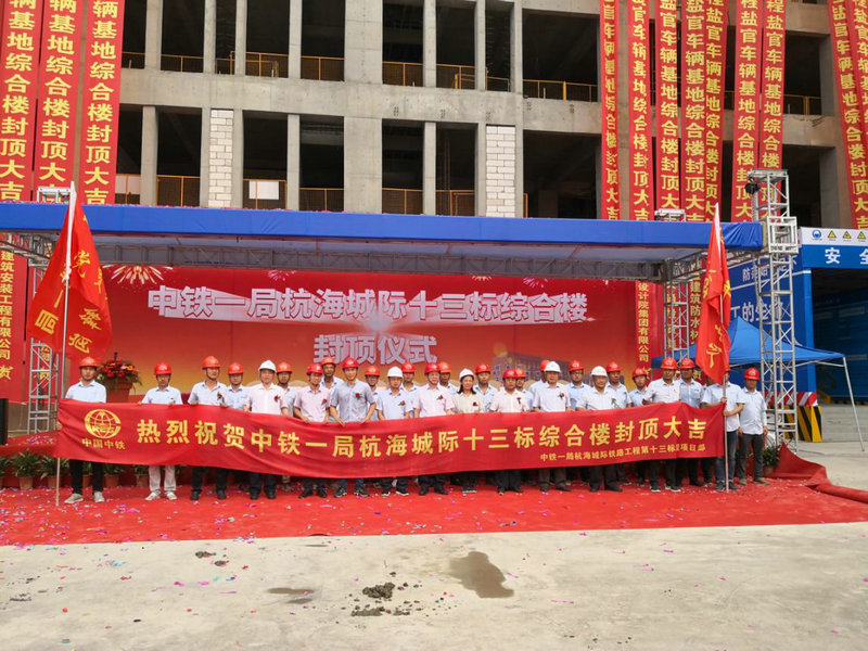 (海寧訊)6月10日,中鐵一局杭海城際鐵路鹽官車(chē)輛基地最大單體工程——綜合樓順利實(shí)現(xiàn)主體封頂。 浙江省交投集團(tuán)軌道部副總經(jīng)理陳明、杭海城鐵公司總經(jīng)理言建標(biāo)、海寧市杭海城鐵指揮部副總指揮湯治安、杭海城鐵公司副總經(jīng)理鄧建林、中鐵(上海)投資有限公司杭海城際項(xiàng)目部項(xiàng)目經(jīng)理張艷文、中鐵一局建安公司工會(huì)主席王淑娟以及來(lái)自監(jiān)理、設(shè)計(jì)單位的領(lǐng)導(dǎo)和嘉賓出席封頂儀式。項(xiàng)目部職工和勞務(wù)工代表共100余人參加。