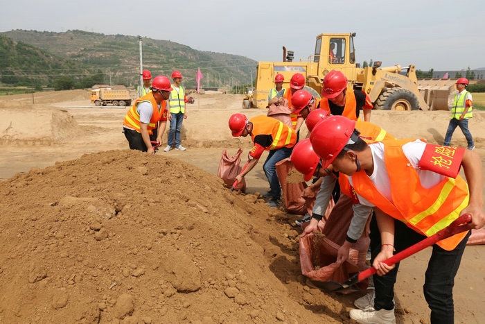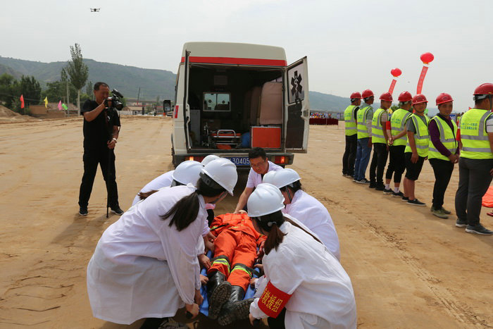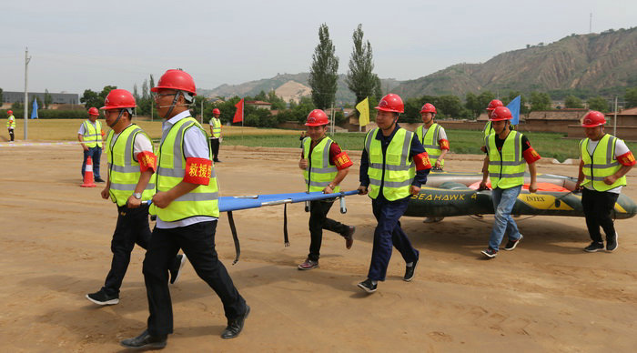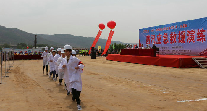 各演練小組奔赴崗位 防汛演練總指揮由甜永高速環(huán)縣段項(xiàng)目辦副主任趙金海擔(dān)任,副總指揮由中鐵二十一局三公司甜永高速9標(biāo)副經(jīng)理白永喜擔(dān)任。直接參與演練的人員達(dá)到70多人,全線13個(gè)土建標(biāo)段、6個(gè)監(jiān)理標(biāo)段、2個(gè)試驗(yàn)標(biāo)、2個(gè)控制標(biāo)、7個(gè)路面標(biāo)共30個(gè)標(biāo)段的安全負(fù)責(zé)人、項(xiàng)目負(fù)責(zé)人到現(xiàn)場(chǎng)觀摩,附近群眾在劃定區(qū)域外觀看,總?cè)藬?shù)達(dá)到360多人。慶城縣應(yīng)急管理局副局長(zhǎng)梁建榮應(yīng)邀親臨現(xiàn)場(chǎng)觀摩,慶城縣人民醫(yī)院派出醫(yī)護(hù)人員和120急救車(chē)參加演練。